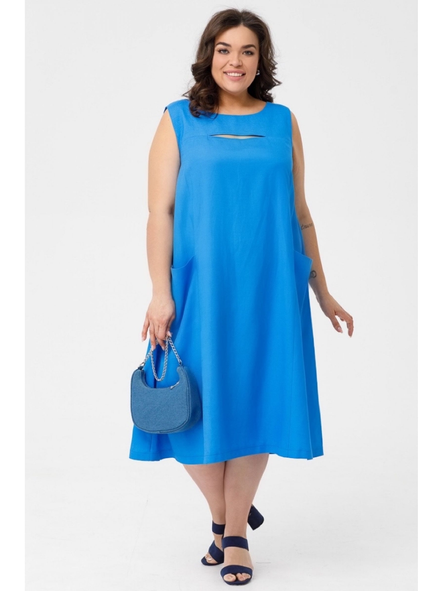 Летний сарафан, трапециевидного силуэта длиной за линию колен выполнен из льняной однотонной ткани. Круглый вырез горловины обработан обтачкой. В верхней части переда горизонтальный вырез. Перед дополнен вертикальными рельефами и удобными большими карманами. Спинка с центральным швом. Комфортная модель для повседневного летнего образа.