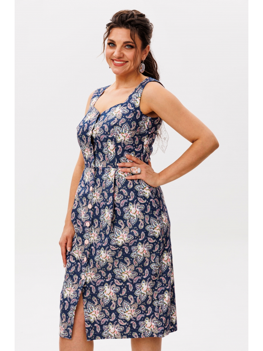 Погрузитесь в атмосферу древних караванных путей с этим восхитительным сарафаном, выполненным в благородном оттенке «восточная синева». Загадочный узор «турецкие огурцы», украшающий лёгкую хлопковую ткань, придаёт образу ноту восточной таинственности и неповторимый колорит.