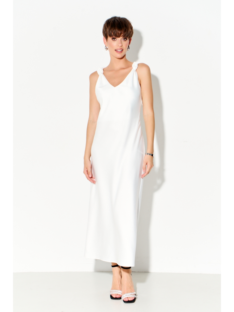 Платье-комбинация длины миди полуприлегающего силуэта выполнено из струящегося шелк - сатина с декоративными регулирующими узлами, в боковой шов вставлена потайная молния.