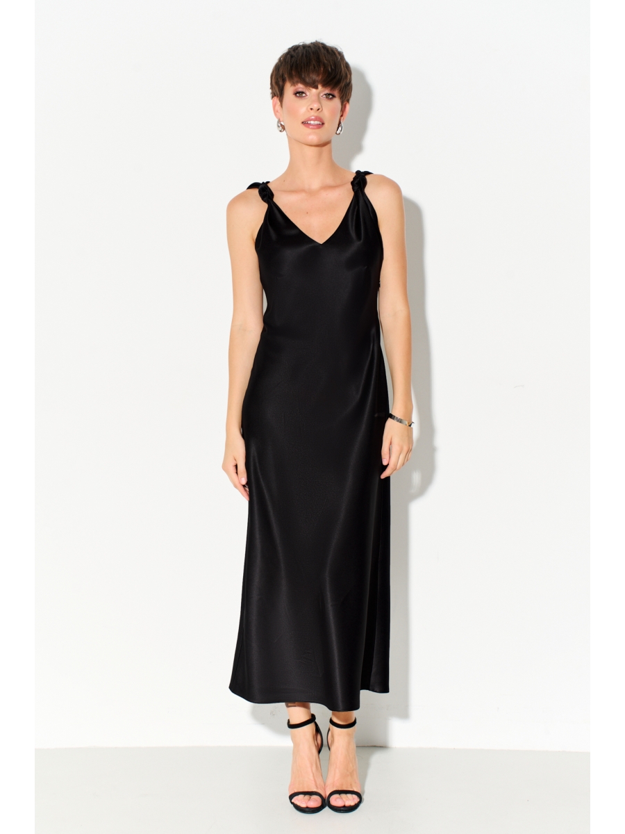Платье-комбинация длины миди полуприлегающего силуэта выполнено из струящегося шелк - сатина с декоративными регулирующими узлами, в боковой шов вставлена потайная молния.