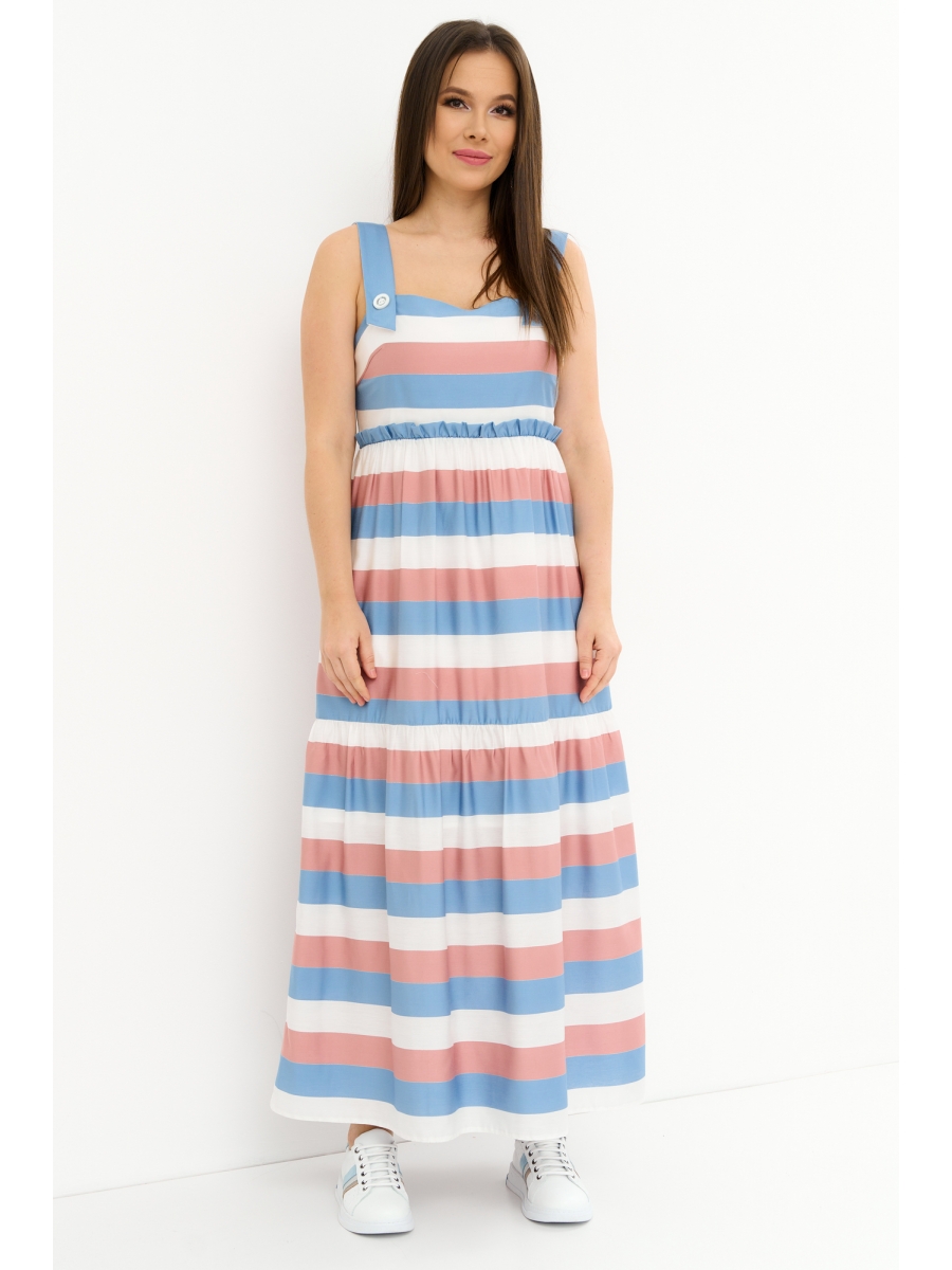 Легкий воздушный сарафан из поливискозного полотна. Сарафан свободного кроя, А-образного силуэта. Дополнен боковыми карманами. По спинке присборен на тонкие резинки. Бретели не съемные, с декоративной пуговицей. Длина сарафана от плечевого шва с учетом бретели 131см. Длина бретели от плечевого шва 17см.