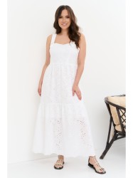 Легкий воздушный сарафан из натурального хлопкового полотна с вышивкой. Сарафан свободного кроя, А-образного силуэта, на хлопковой подкладке. Дополнен боковыми карманами. По спинке присборен на тонкие резинки. Бретели не съемные, с декоративной пуговицей.