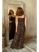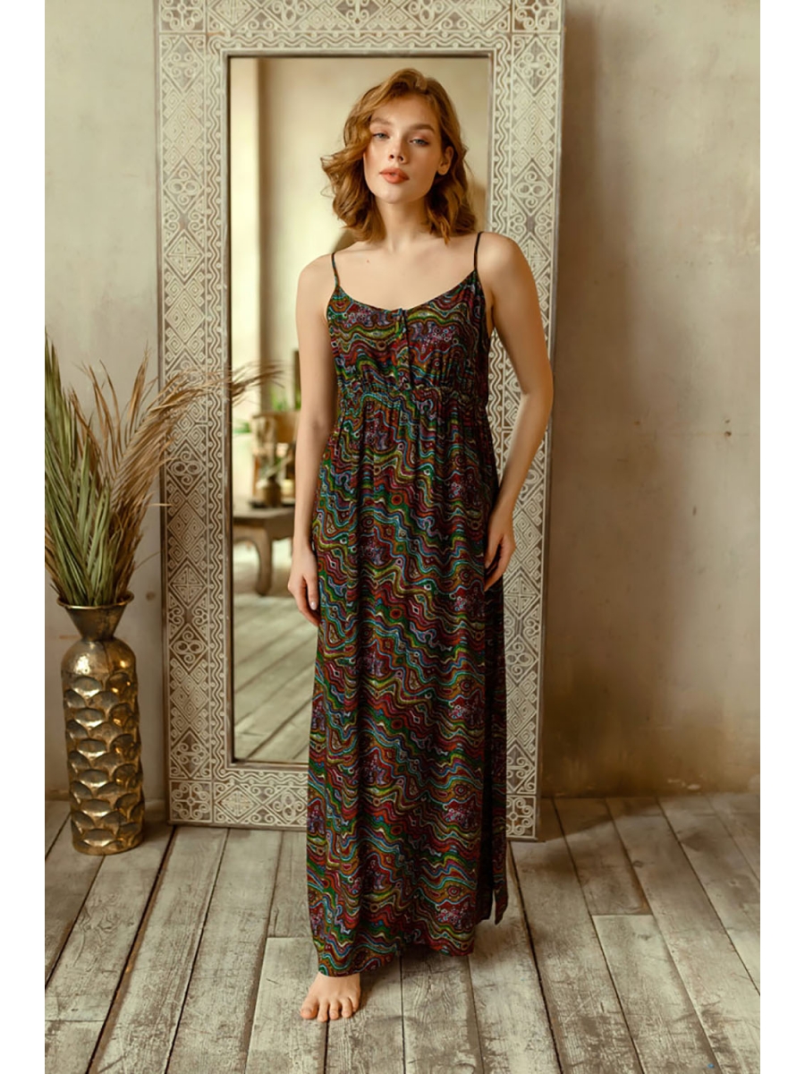 Платье прямого силуэта выполнен из вискозы с фантазийным принтом. Лиф отрезной, чуть вышеВ В линии талии на эластичной тесьме "резинке". Спереди планка на 4-х пуговицах и петлях. Тонкие бретели позволяют регулировать высоту лифа данной модели.