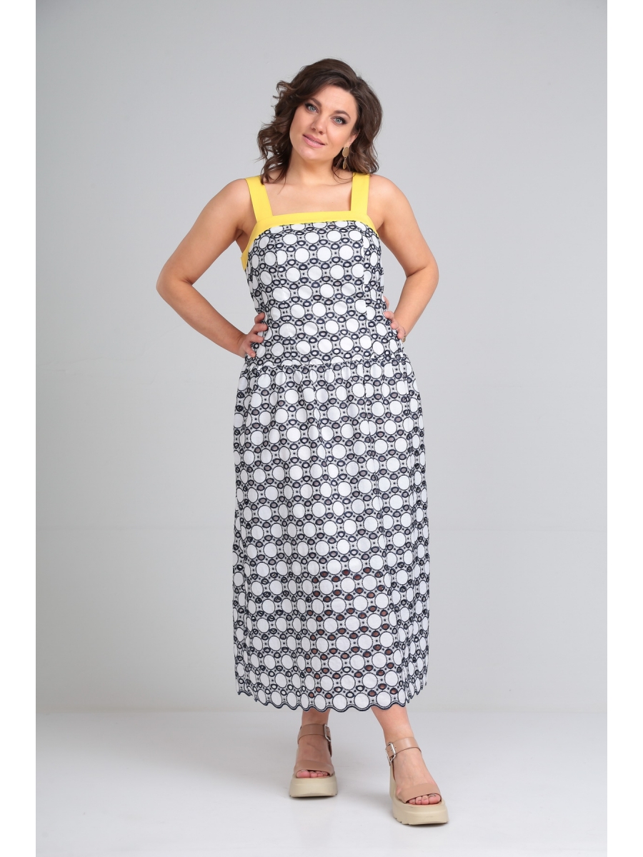 Платье-сарафан из хлопка «шитье» (не тянется) полуприлегающего силуэта на бретелях из контрастной отделочной ткани. Сарафан на хлопковой подкладке. Сарафан отрезной чуть ниже линии талии. Низ присборен по шву притачивания. По лифу переда рельефные швы и притачная планка из отделочной контрастной ткани желтого цвета. По лифу спинки средний шов и притачная планка из отделочной контрастной ткани, присборенной с помощью резинки.