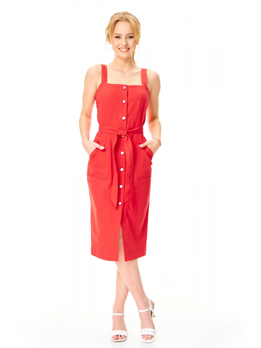 Яркий красный сарафан из тонкого денима со стрейчем длиной за колено полуприлегающего силуэта. Застегивается по подборту на металлические пуговицы. Накладные карманы на бедрах. Бретели широкие. Пояс съемный завязывается. Платье без подкладки.