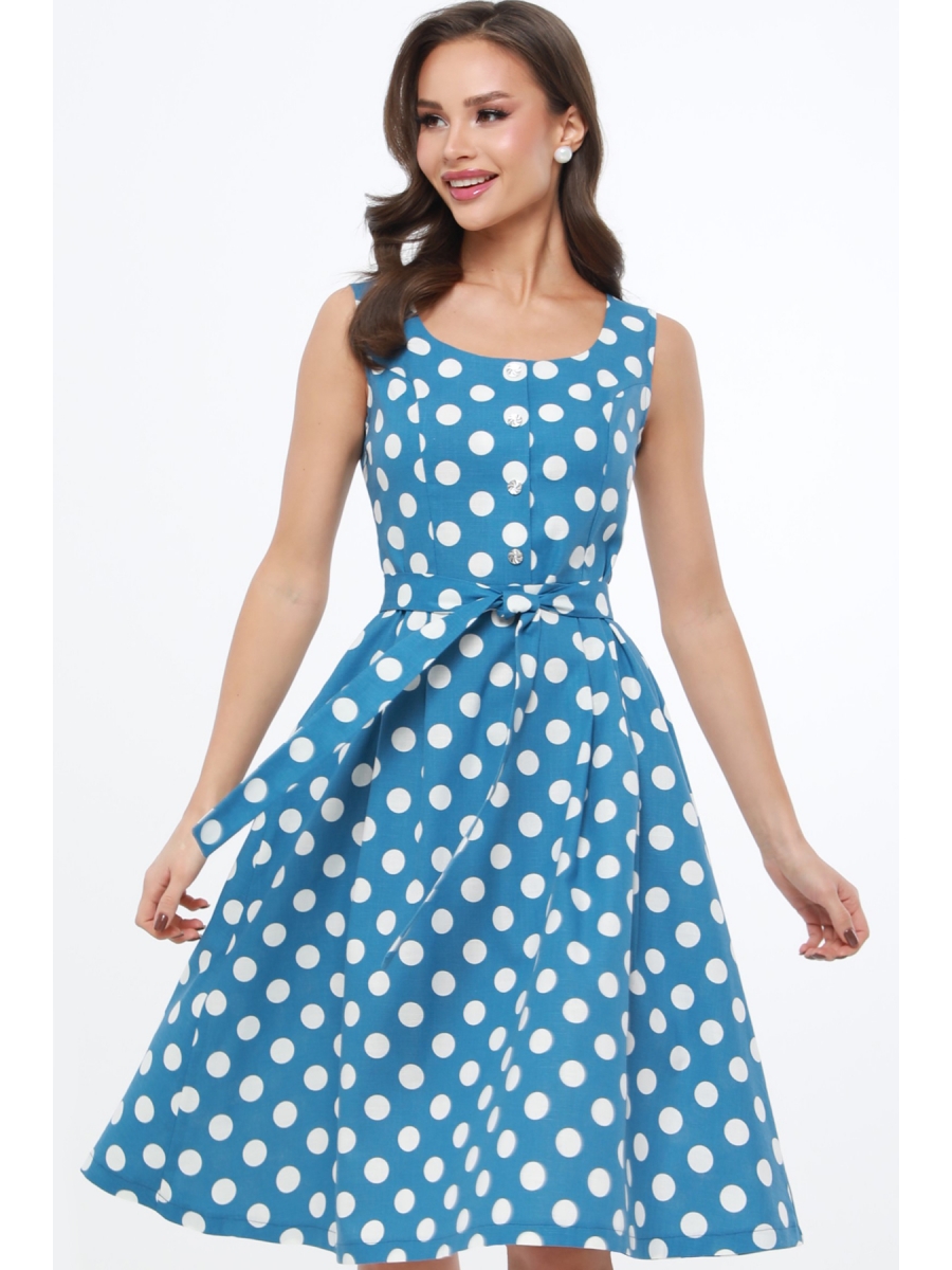 Платье-сарафан для лучших летних дней. Прилегающий верх с рельефным кроем на груди и застежкой на пуговицы подчеркивает расклешенность юбки и все это создает вечно актуальный силуэт нью-лук, женственный и элегантный. В комплекте к платью прилагается пояс.