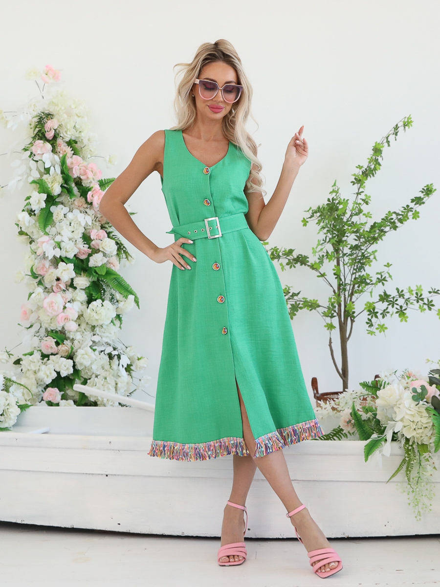 Эффектное платье прямого силуэта из текстильной ткани зеленого цвета. Фигурный вырез и проймы рукавов обработаны внутренней обтачкой. По переду изделия выполнена планка с застежкой на пуговицы. По низу изделия декоративная тесьма.