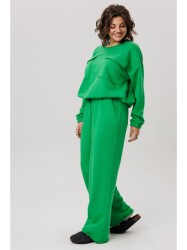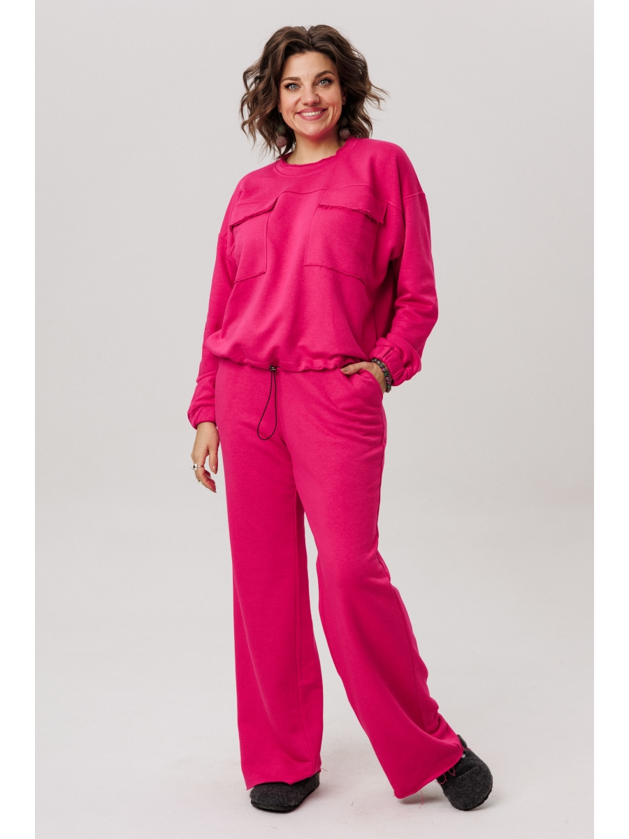 Верхняя часть костюма, выполненная в виде объемного свитшота, представляет собой мастерское сочетание расслабленных линий и продуманных деталей. Удлиненная линия плеча и длинные рукава струятся мягкими складками, завершаясь аккуратной манжетой. Фронтальная часть оформлена изящной отрезной кокеткой, а накладные карманы с клапанами, добавляют образу тактильной выразительности. Низ свитшота, оформленный на кулиске, позволяет вам самостоятельно регулировать степень свободы и объем, делая силуэт именно таким, как вам хочется сегодня.