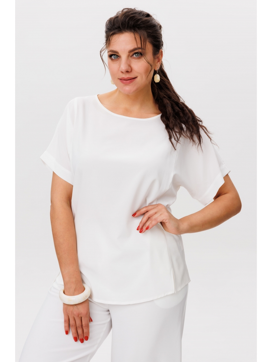 Элегантный округлый вырез горловины подчеркивает женственность, сохраняя при этом сдержанность и универсальность. Передняя часть топа украшена центральной деталью из отделочной ткани, которая придает модели изысканный акцент, не перегружая общий вид.