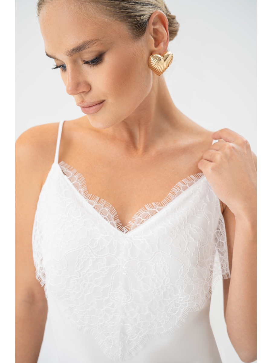 Блузка женская ЮРС, на бретелях, полуприлегающего силуэта, выполнена из блузочной ткани на подкладке, может быть как нарядная, так и повседневная. Перед с нагрудными вытачками, выходящими из боковых швов. Верхняя часть переда декорирована кружевом. Низ переда и спинки фигурной формы: короче у боковых швов, длиннее к центрам.