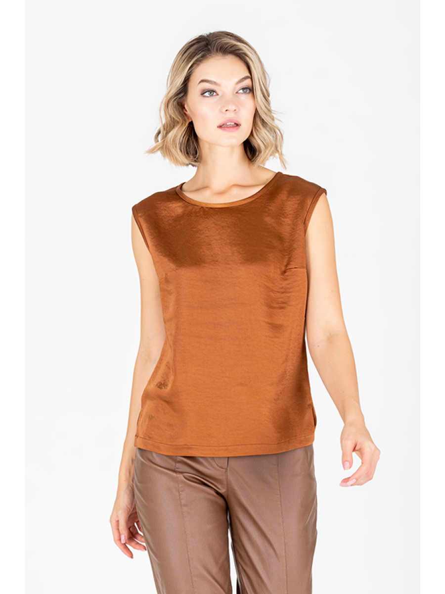 Нарядный топ из блузочной ткани с лёгким крэш эффектом и благородным блеском. Свободный силуэт, с небольшими разрезами в боковых швах. Круглый вырез горловины и линия проймы окантованы косой бейкой из основной ткани. Изделие красиво бликует при разном освещении. Ткань имеет очень приятную бархатистую фактуру с изнаночной стороны, что обеспечивает комфортное ношение.