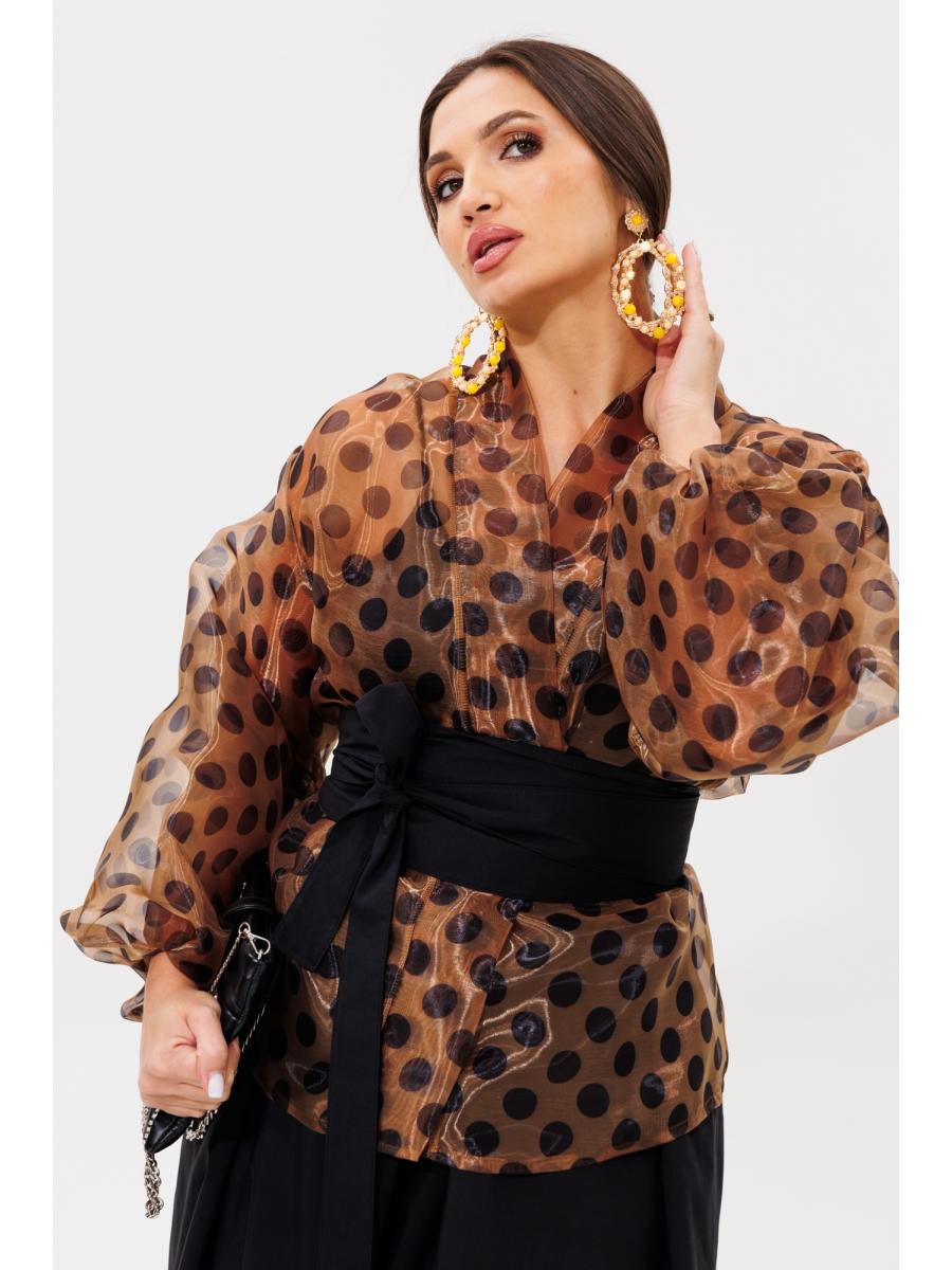 Туника женская прямого силуэта из органзы в горохи со спущенной линией плеча. С ее помощью легко можно трансформировать повседневный образ в праздничный. Идеально сочетается с брюками, юбкой, платьем. Рукав двойной, расширенный к низу со складками. По спинке и полочке идет планка.