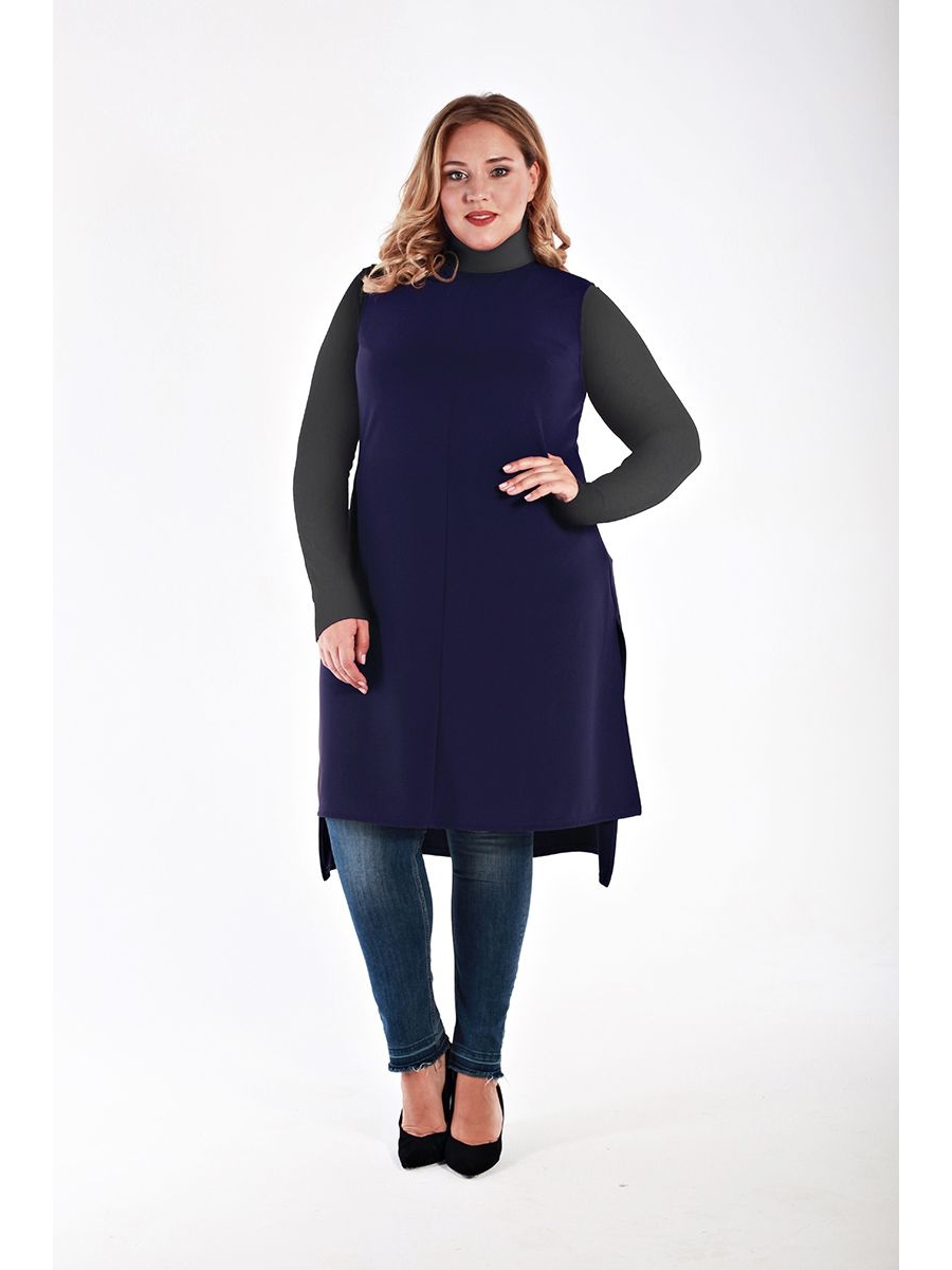 Туника удлиненная, без рукавов, из джерси с антипиллинговой обработкой. Силуэт полуприлегающий, расклешенный от линии бедер, с разрезами в боковых швах. Передняя часть короче задней на 12 см. Идеально сочетается с джинсами или узкими брючками.