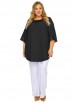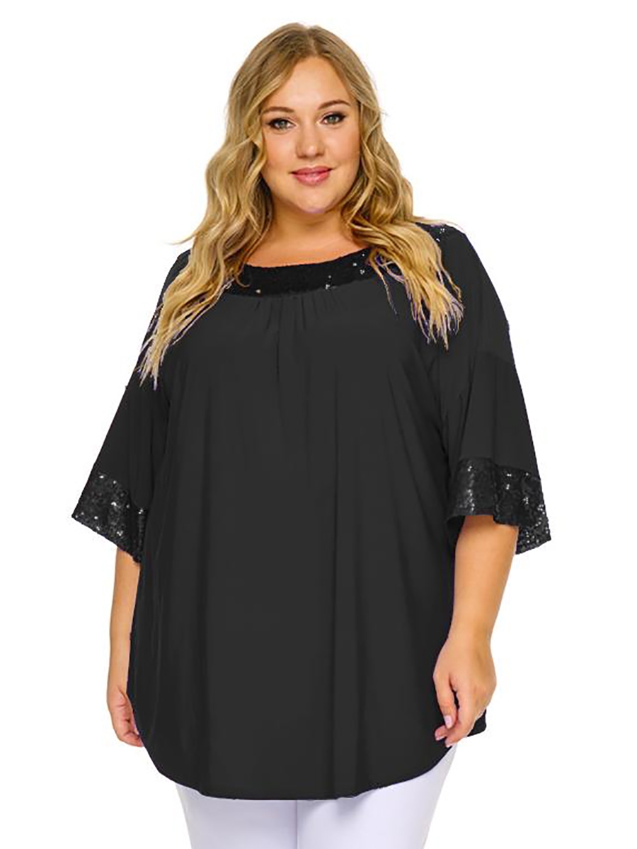 Стильная туника из трикотажа свободного силуэта. Горловина на закругленной кокетке, отделана пайетками. По центру спинки из-под кокетки - встречная складка. Линия плеча спущенна, рукав расширенный, заканчивающийся свободным манжетом из пайеток.