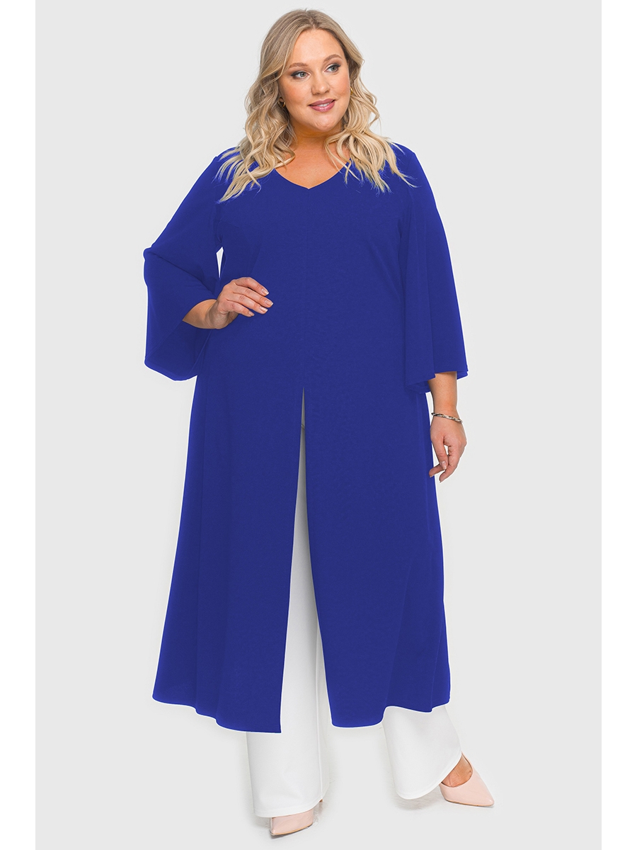 Удлиненный кардиган А-силуэта из крепа с эластаном. V-вырез горловины переда. По центральному шву переда разрез. Рукав расклешенный.