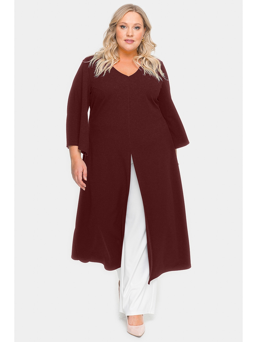 Удлиненный кардиган А-силуэта из крепа с эластаном. V-вырез горловины переда. По центральному шву переда разрез. Рукав расклешенный.