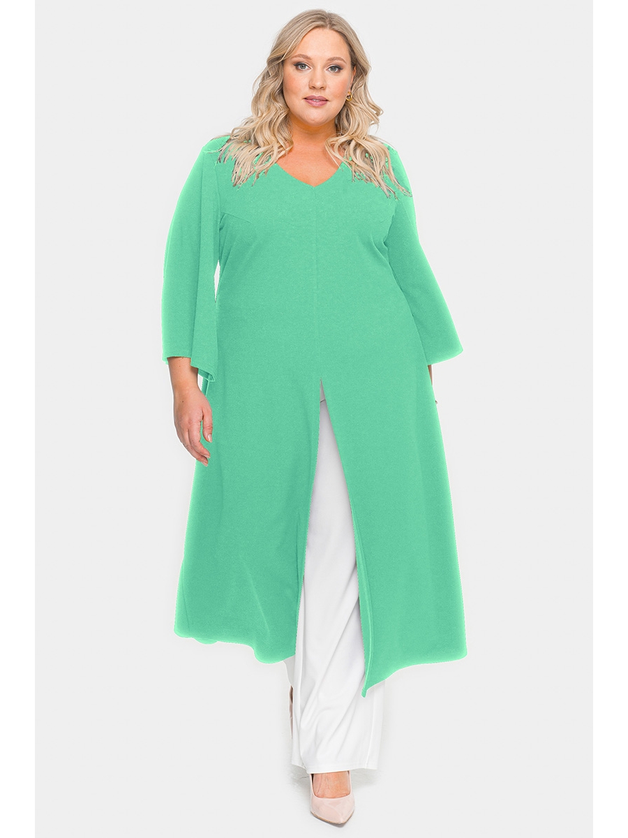 Удлиненный кардиган А-силуэта из крепа с эластаном. V-вырез горловины переда. По центральному шву переда разрез. Рукав расклешенный.