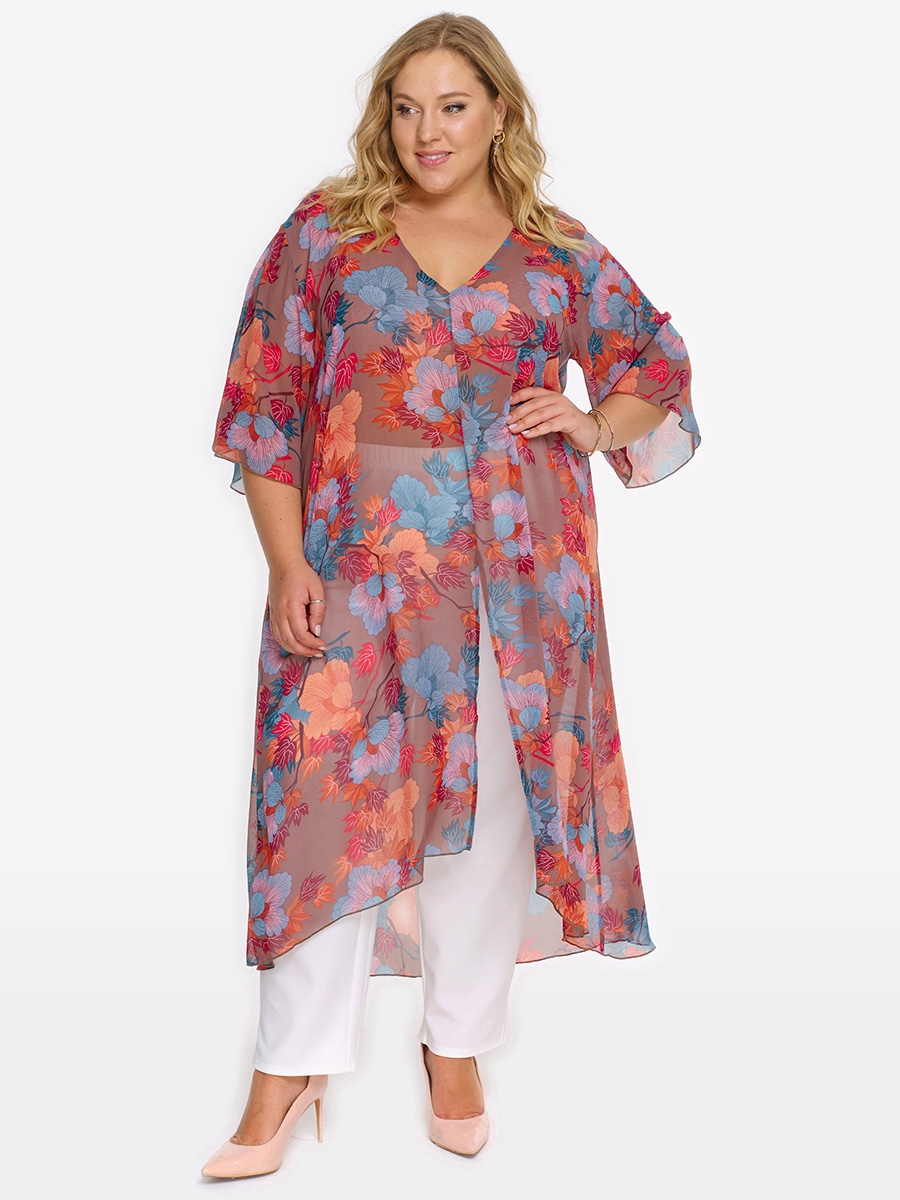 • Название: Туника удлиненная асимметричная, шифон кофейный, принт яркий