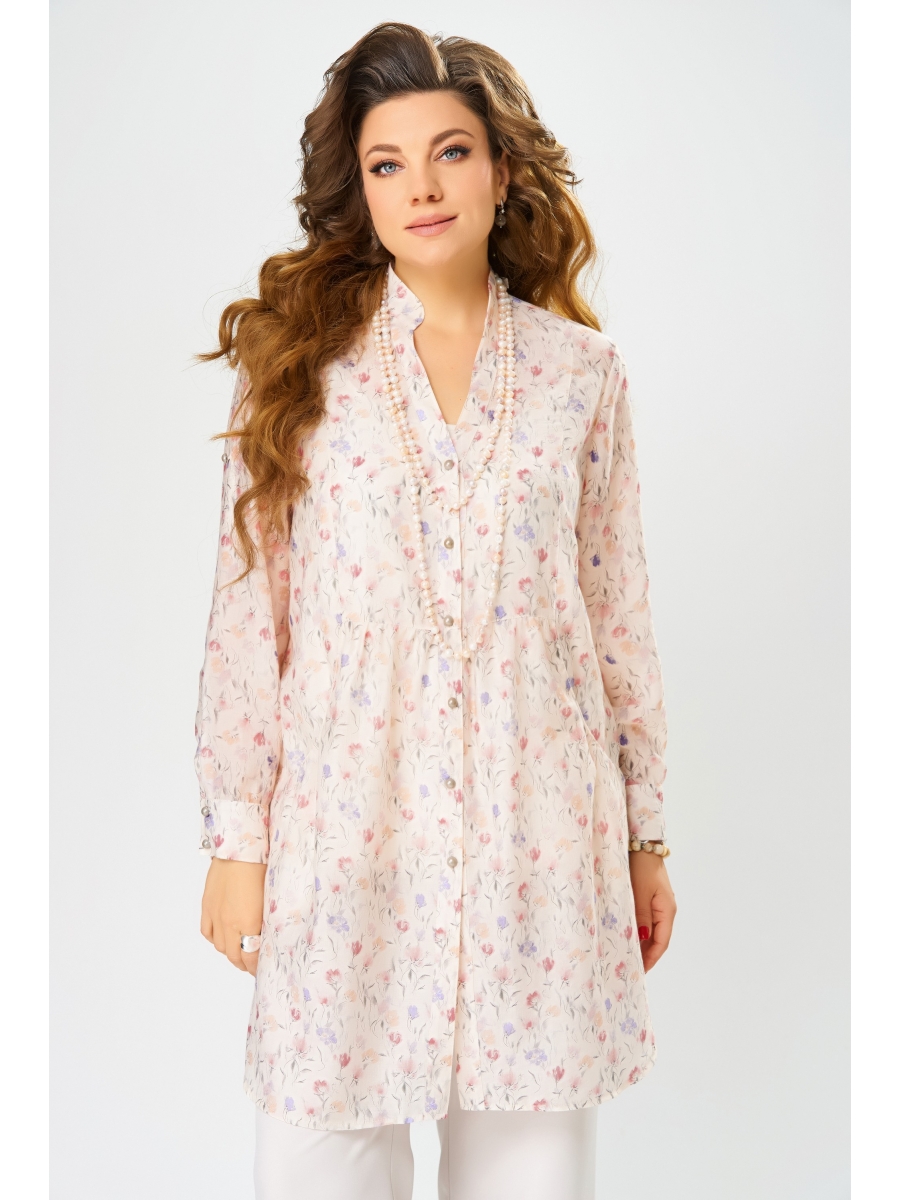 Туника «Медея» — это воплощение легкости и изящества, созданное для тех, кто ценит элегантность и комфорт. Выполненная из воздушной ткани «Вуаль» с модным цветочным принтом, она придаёт образу утонченность и женственность. Прямой силуэт обеспечивает свободу движений, а слегка прозрачная структура ткани добавляет нотку загадочности. Втачной длинный рукав дополнен притачной манжетой с застежкой на пуговицы, позволяя регулировать длину с помощью паты. Фигурный вырез горловины, оформленный отрезными планками, и воротник-стойка создают стильный акцент, а застежка на пуговицах придает практичность. Изящные фигурные карманы со сборкой на передней части подчеркивают оригинальность дизайна, а подрез по линии талии с мягкими складками создаёт утонченный силуэт. Фигурный низ с боковыми разрезами придаёт легкость и динамику.