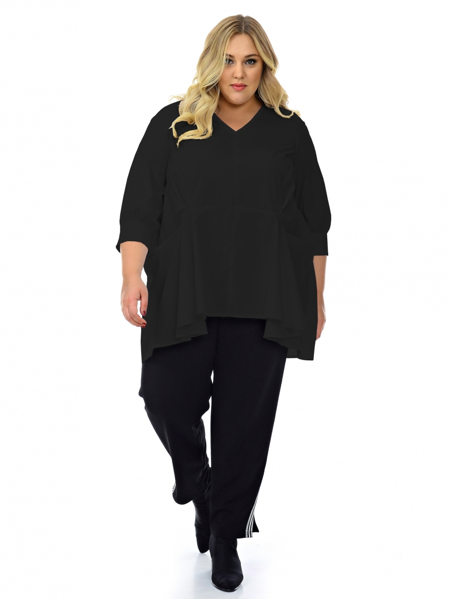 Туника-рубашка в стиле casuaI из вискозного полотна. Модель свободного силуэта, с асимметричной линией низа. V-вырез горловины по переду. Рукав свободный, на основе спущенного, с манжетой и сборочкой по низу. На деталях переда необычная драпировка, маскирующая нюансы фигуры.