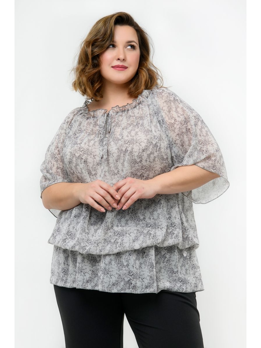 Туника из шифона свободного силуэта. Рукав на основе реглан. Линия горловины расширена, на резинке, за счет чего можно приоткрыть плечи. На уровне линии талии напуск, зафиксированный резинкой.
