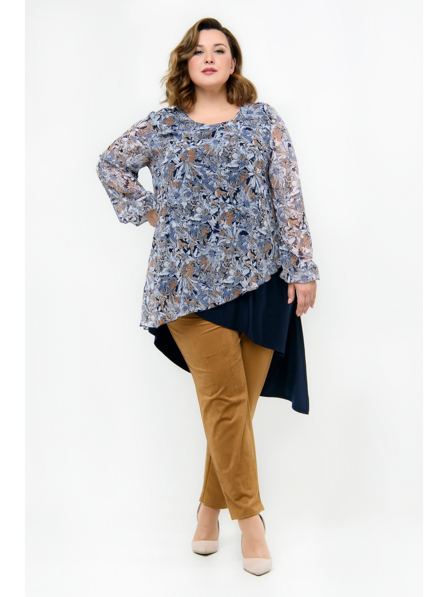 Стильная многоуровневая туника из легкого темно-синего трикотажа, комбинированного с принтованым шифоном . Внутренняя часть переда и спинка из трикотажа, верхняя часть переда и рукава из шифона. В боковых швах разрезы. Линия низа асимметричная. Рукав длинный, свободный, на резиночке по низу. Грамотно проработанные разноуровневые вертикали правильно корректируют и зрительно вытягивают силуэт.