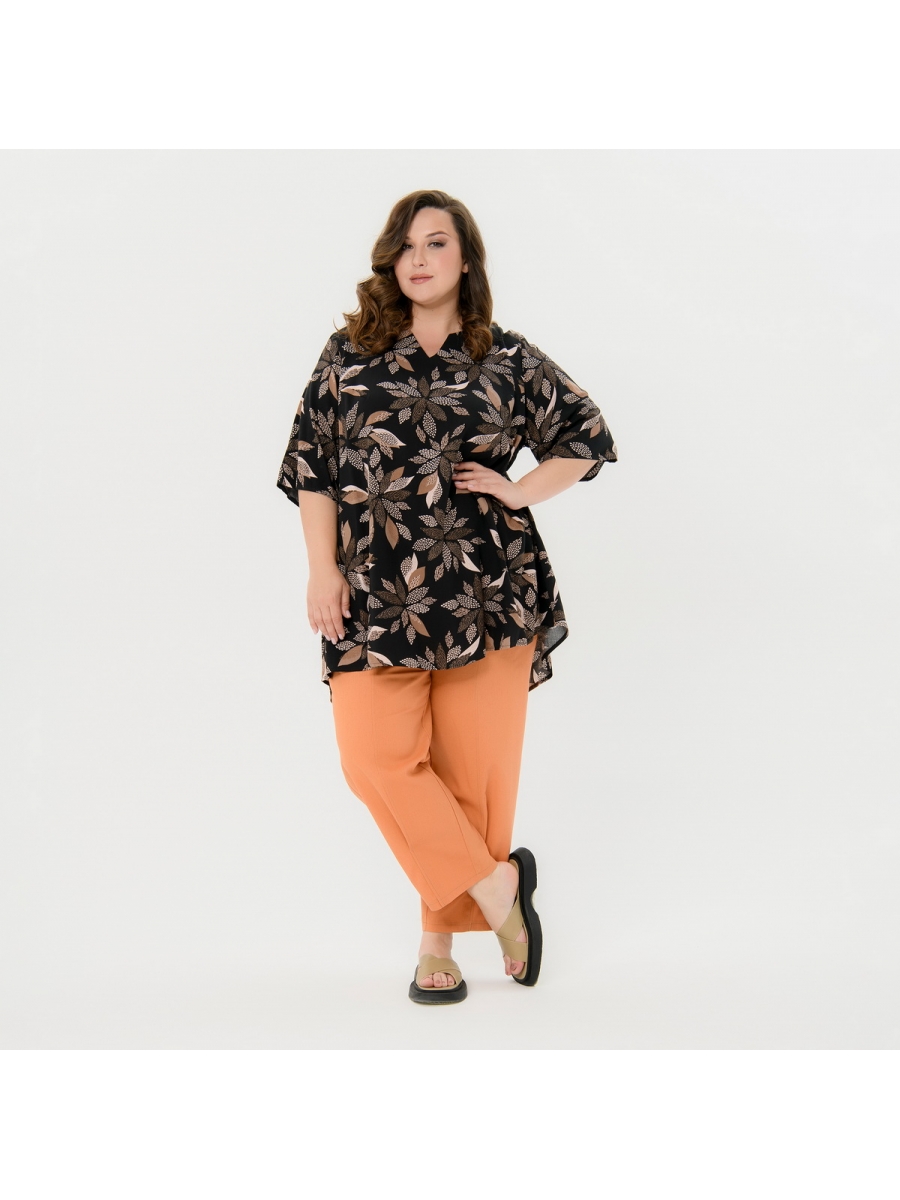 Свободная туника из штапеля с фигурным вырезом горловины переда. Линия низа по спинке удлиненная закругленная.