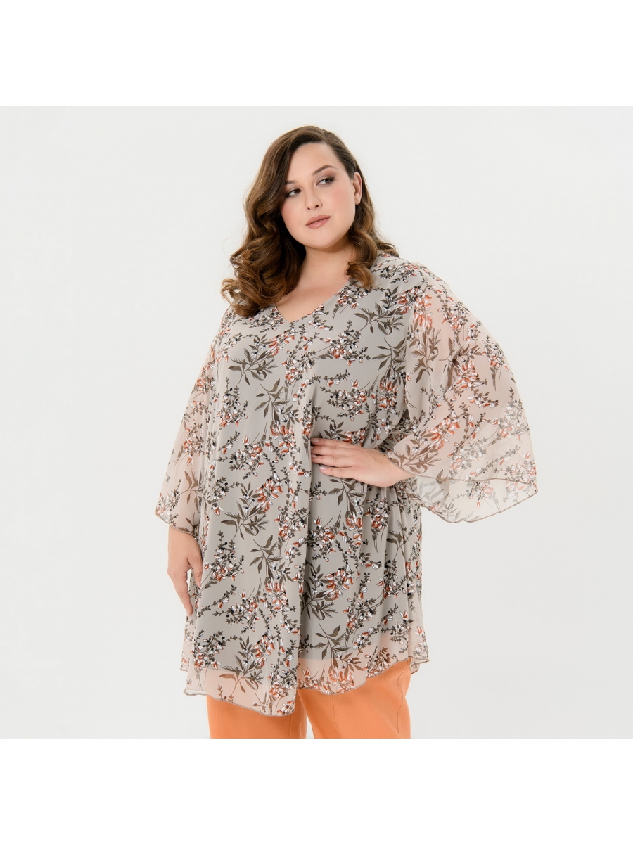 Свободная туника из шифона. V-вырез горловины по переду. Рукав расклешенный. Идеально сочетается с джинсами, зауженными брючками.