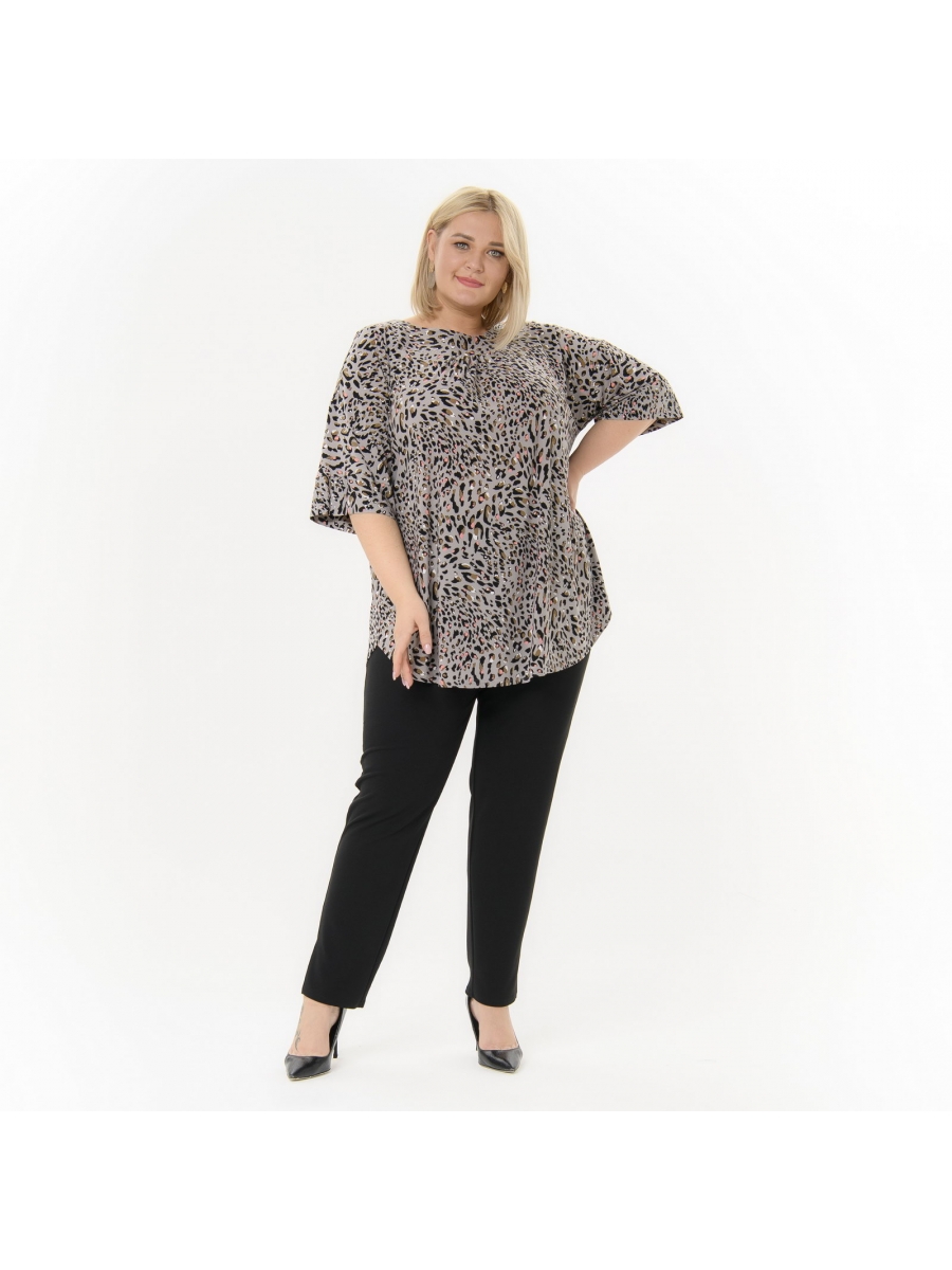 Свободная туника из трикотажа "масло". Горловина на широкой закругленной обтачке. По центру переда из под кокетки сборочка, по центру спинки встречная складка. Линия плеча спущена, рукав прямой, расширенный.