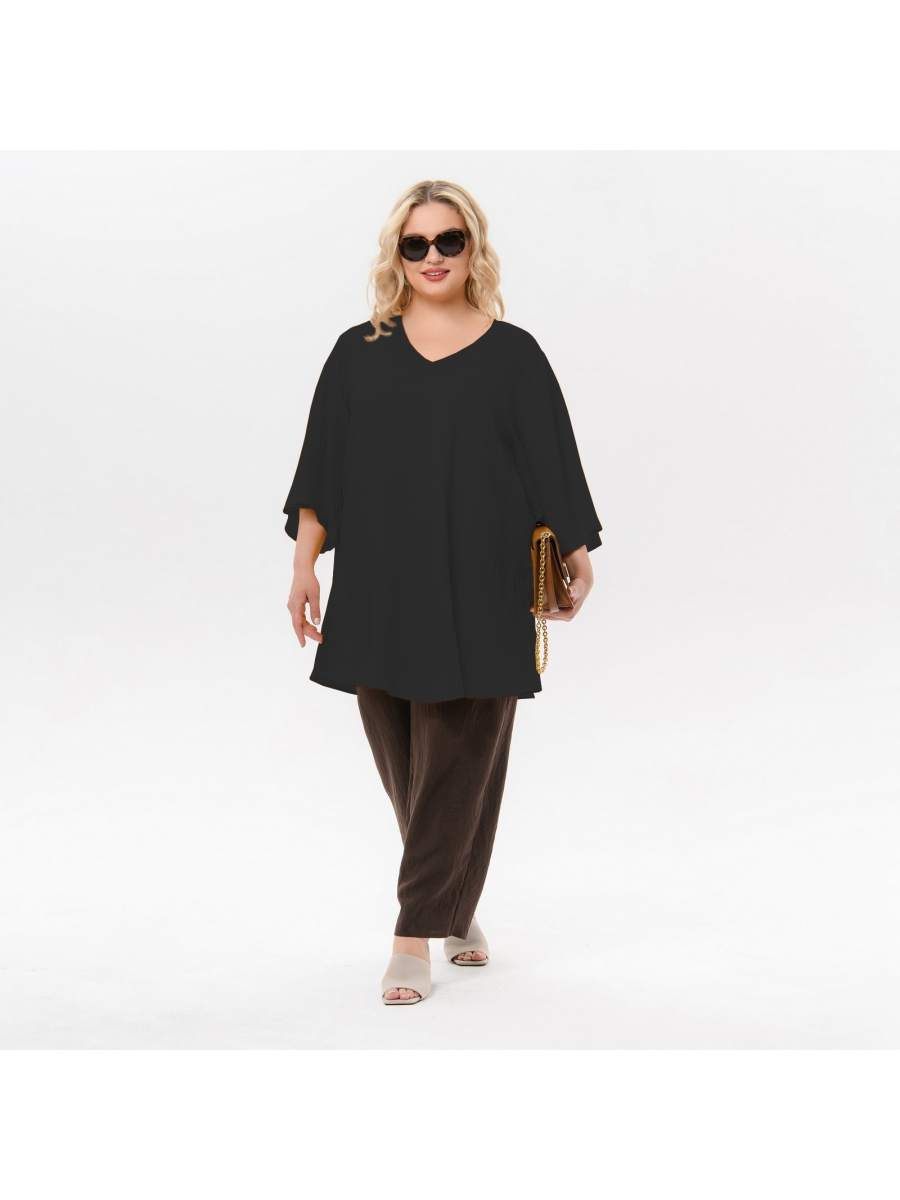 Туника свободного силуэта из плательной ткани средней плотности. V-вырез горловины. Рукав расклешенный, линия плеча спущена.