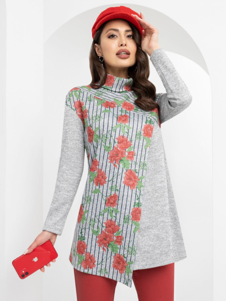 О чем мечтает женщина? Об интересном и удобном наряде на каждый день. Модная туника с асимметричным кроем – отличный выбор. Уютный воротник, женственный принт, удлиненный фасон – то что надо! Берём!