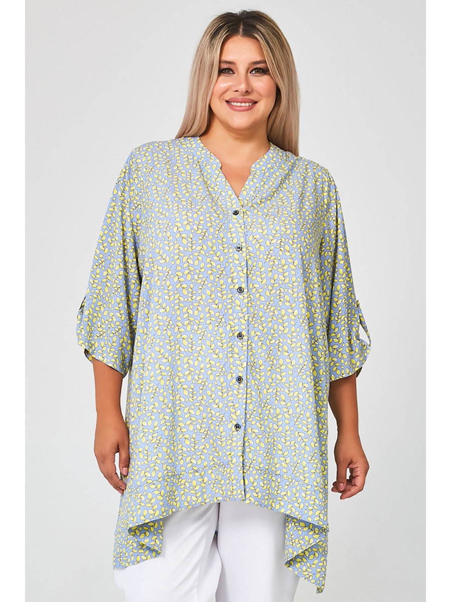Свободная туника трапециевидного силуэта из легкой хлопчатобумажной ткани. V-образный вырез горловины оформлен воротником - стойкой. Центральная застежка с планкой на петли и пуговицы. Укороченные втачные рукава длиной 3/4, дополнены патой. Модель с ассиметричным низом - подчеркнутым притачной обтачкой. Туника разнообразит Ваш повседневный гардероб и отлично дополнит джинсы или брюки.