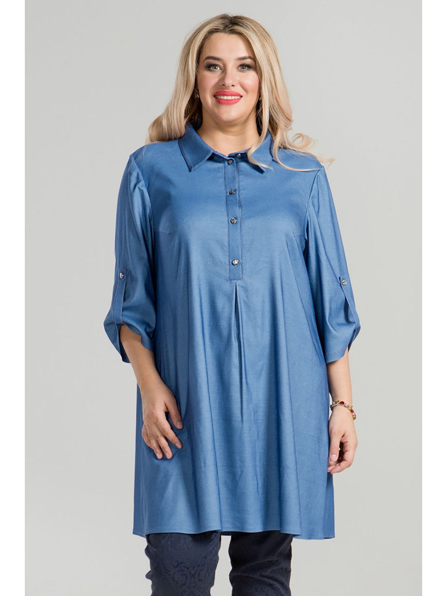 Свободная туника из джинсовой ткани. По переду - центральная застежка с планкой на петли и пуговицы, горловина дополнена рубашечным воротником на стойке. Прилегание по груди за счет вытачек. Укороченные втачные рукава длиной 3/4, дополнены патой. В боковых швах удобные карманы.