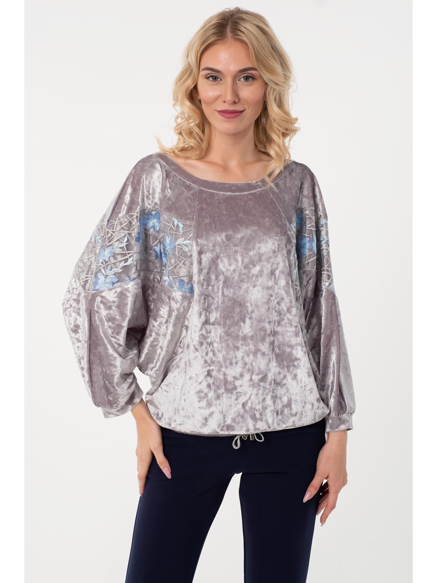 Эффектный джемпер свободного силуэта из трикотажного бархата серого цвета. Круглый вырез изделия обработан внешней обтачкой. Цельнокроеные рукава обработаны манжетами и дополнены вставками из декоративного кружева. По низу изделия выполнена кулисками со шнурком.. Длина изделия по спинке от плечевого шва до низа изделия — 64 см. Рост модели - 170 см.