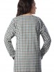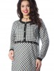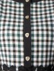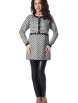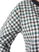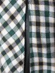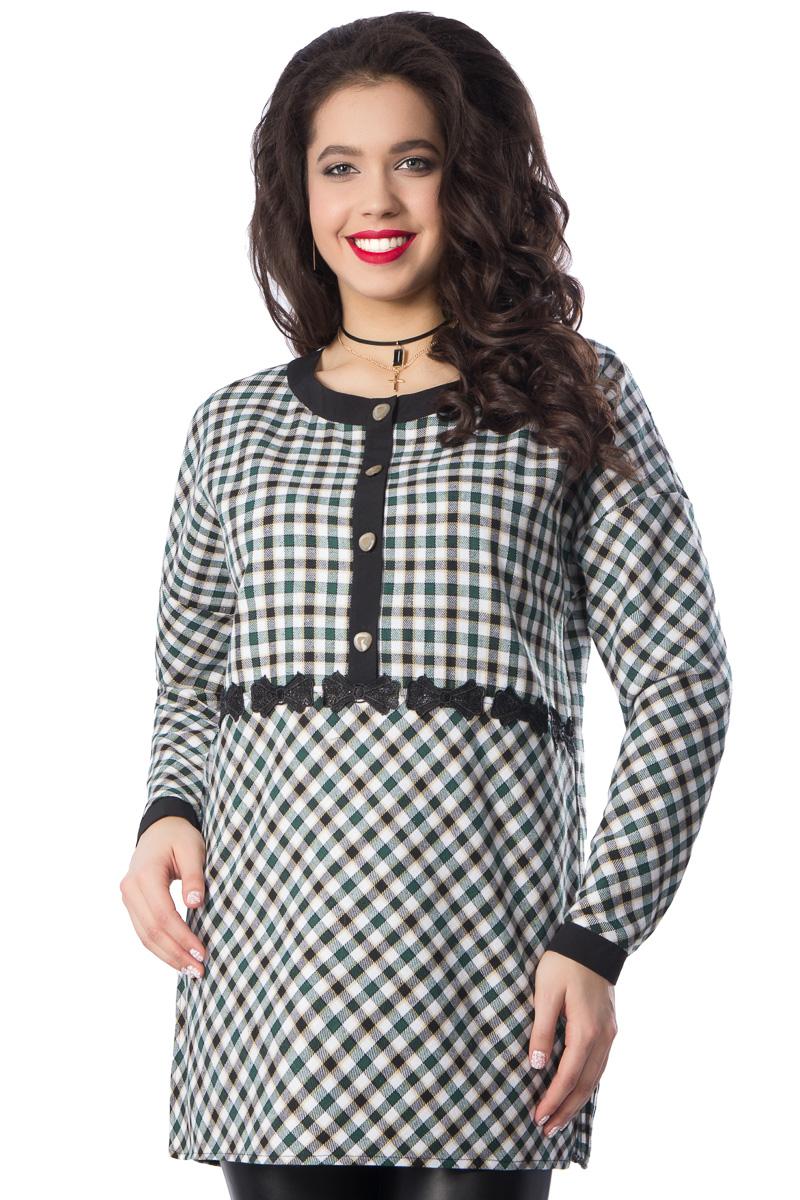 Милая туника прямого силуэта из текстильного полотна в клетку зеленого цвета. По переду изделие отрезное по линии талии и украшено кружевной тесьмой черного цвета. Круглый вырез туники обработан широким контрастным кантом и дополнен планкой с застежкой на пуговицы. Втачной рукав со спущенной линией проймы понизу обработан манжетом контрастного черного цвета с застежкой на пуговицу. По боковым швам блуза дополнена разрезами.