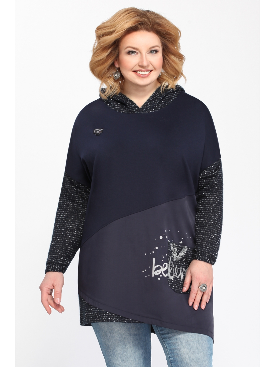 Блузон женский, прямого силуэта, скомбинирован из трикотажа однотон, трикотажа "lдизайн" и плащевки с накладным карманом, нанесена печать. Блузон с капюшоном, рукава с манжетами. Реальные параметры ширина изделия на уровне глубины проймы 33см от основания шеи 58-130см, 60-134см. 62-138см, об 58-130см, 60-134см, 62-138см.