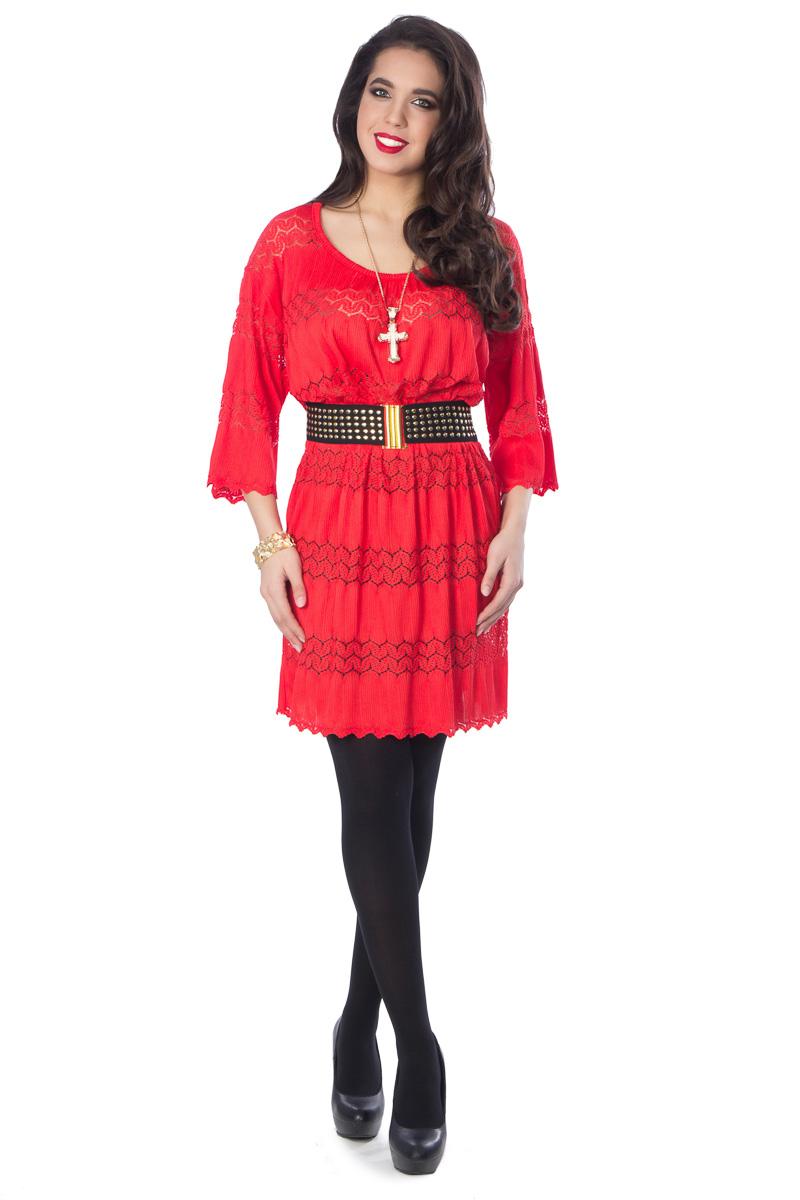 Эффектное платье-туника свободного силуэта из трикотажного кружевного полотна красного цвета. Круглый вырез изделия обработан окантовкой. Изделие с втачными рукавами. По низу изделия и рукавов - кружевные фестоны. Аксессуары в комплект не входят.