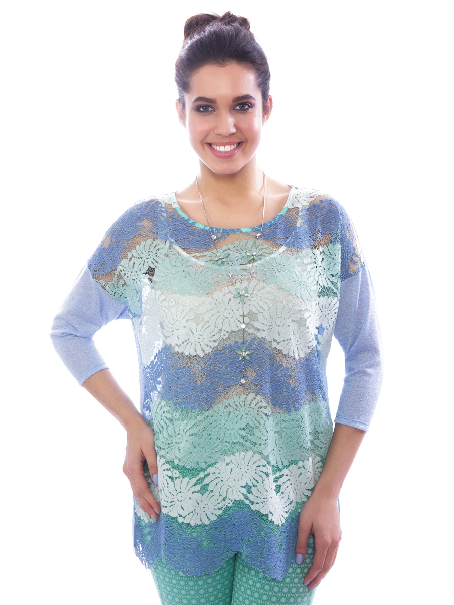 Великолепный джемпер свободного силуэта из трикотажного полотна голубого цвета. Горловина изделия обработана внутренней атласной бейкой. Перед выполнен из кружевного полотна. Втачные рукава со спущенной линией проймы. По низу в боковых швах изделия — разрезы. Спинка джемпера немного длинее, чем перед.