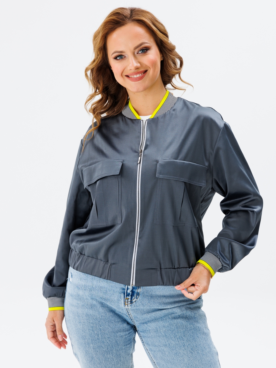 Бомбер прямого силуэта со слегка спущенным плечом из хлопковой ткани сатин, собран на резинку понизу. По переду настрочены карманы с встречной складкой и клапаном. Застежка на молнию по переду. Горловина обработана довязом. Рукав втачной одношовный собранный понизу на довяз.