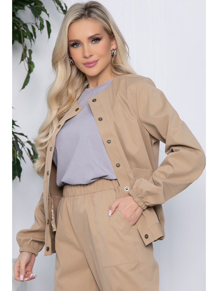 Куртка-бомбер в бежевом оттенке - идеальный вариант для летнего гардероба! Когда на улице ветрено, надевайте под него лонгслив, а если тепло, то майку или футболку. Рукав втачной, длинный, по переду застегивается на кнопки, есть карманы.