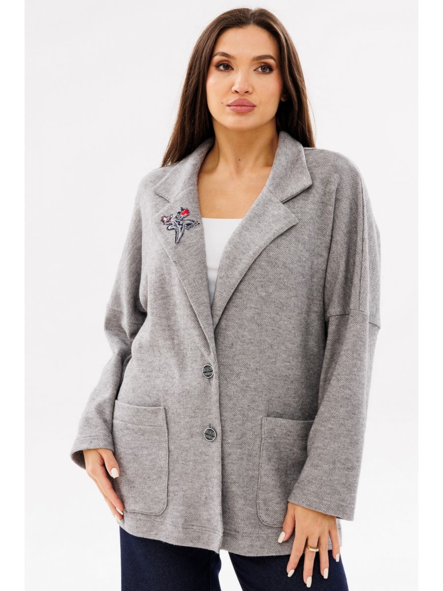 Воротник пиджачного типа. Перед с накладными карманамии декоративной нашивкой. Застежка центральная на петли и пуговицы. Спинка со средним швом. Рукав длинный одношовный втачной, линия плеча спущена.