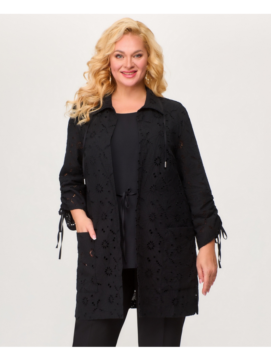Кардиган прямого силуэта, ниже линии бедра, из хлопковой ткани «шитье». По горловине отложной воротник с кулисой. По переду накладные карманы. По линии талии с внутренней стороны завязки. В боковых швах разрезы.