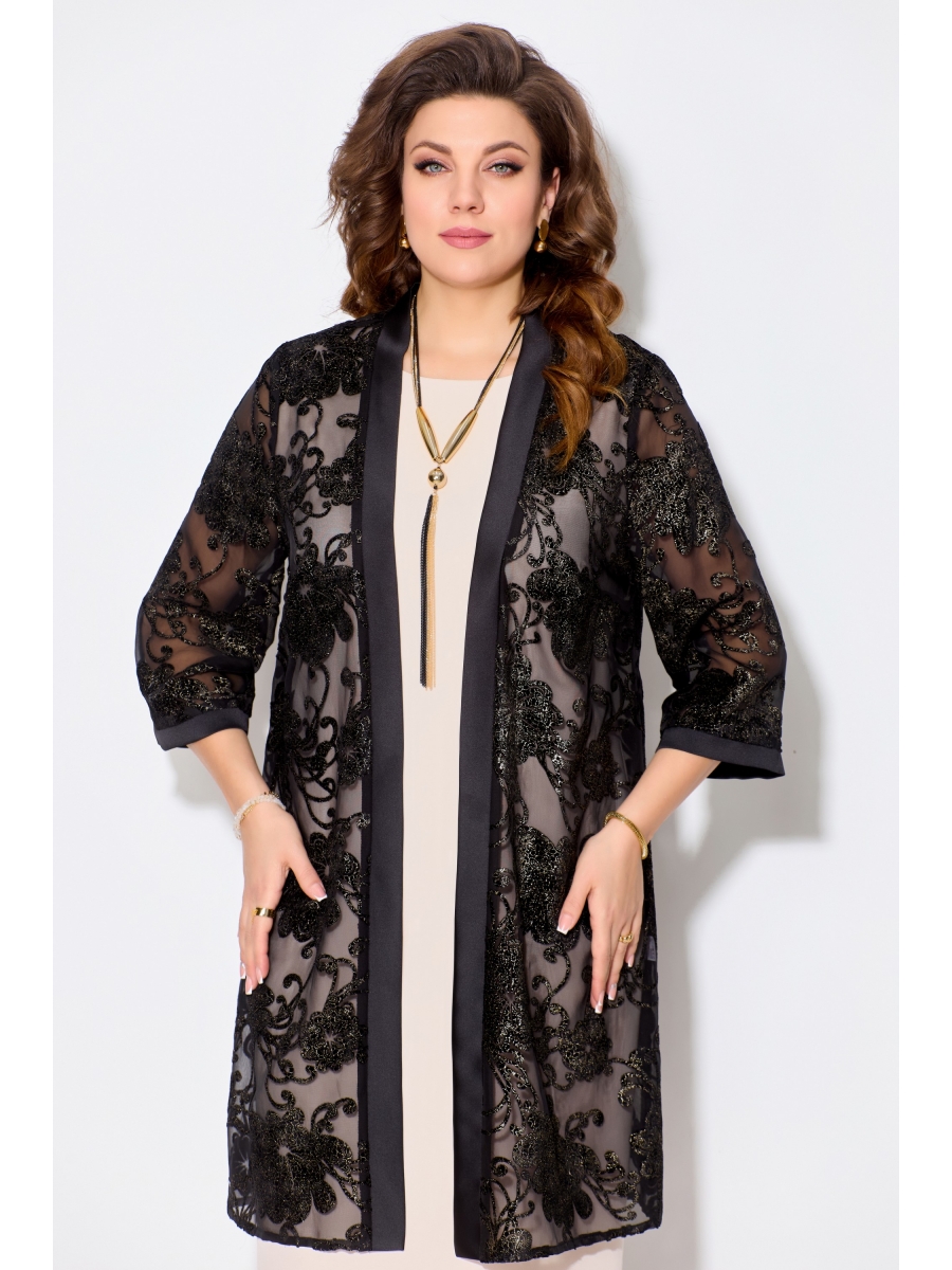 Кардиган нарядный "Гарца" прямого силуэта с атласной отделкой на планке. Планка по борту и низу рукава из атласа. Низ обработан швом в подгибку, выточка по груди.
