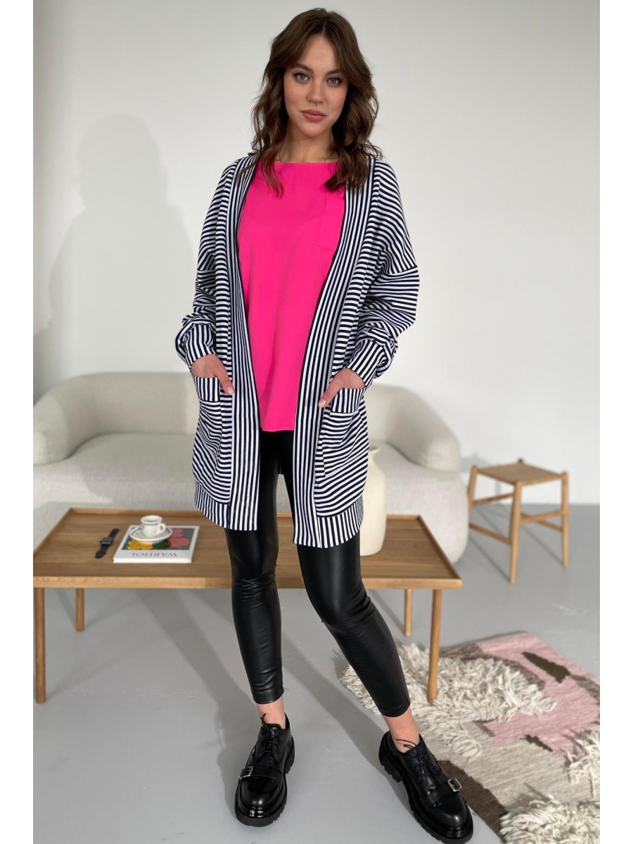 Кардиган женский из трикотажной ткани,свободного силуэта. По переду кардигана расположены настрочные карманы. Рукав спущенный,оформлен манжетой. Низ кардигана и горловины оформлены притачной бейкой.