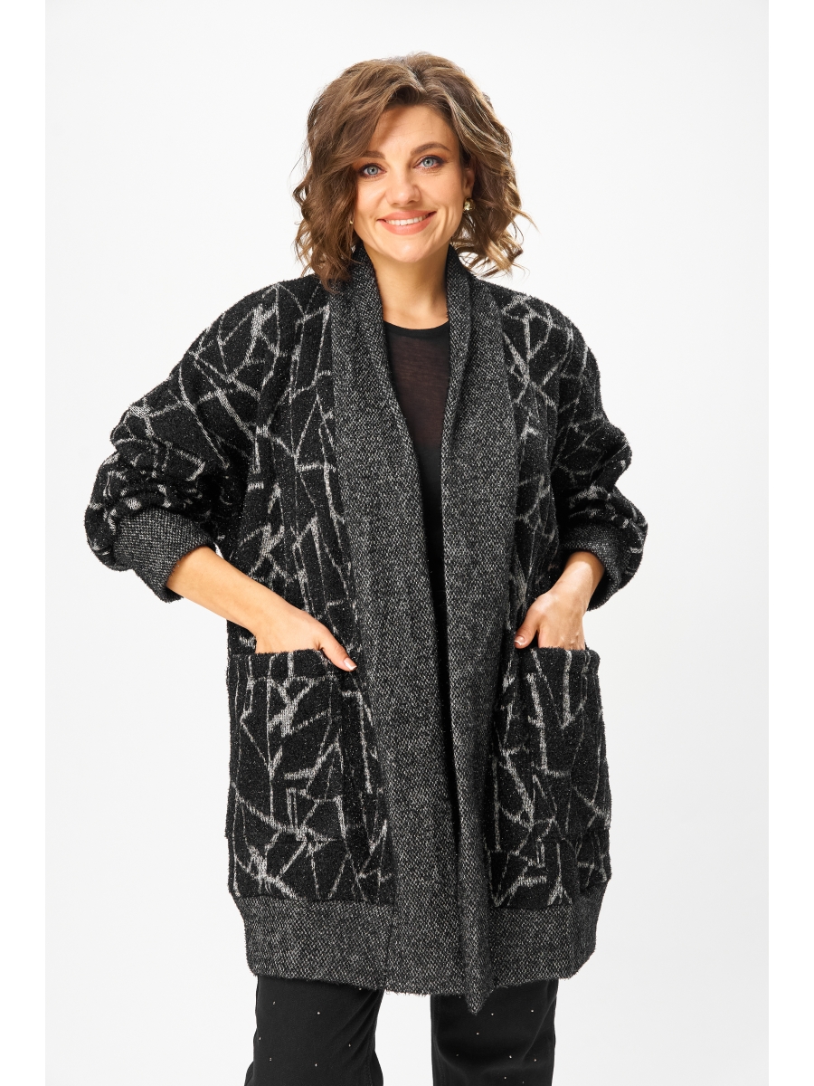 Фактурная пряжа с чёрной и серебристой люрексовой нитью делает его нарядным, но при этом практичным. Он идеально подходит как второй слой — эффектный, комфортный и универсальный: для офиса, прогулок или выхода в свет.