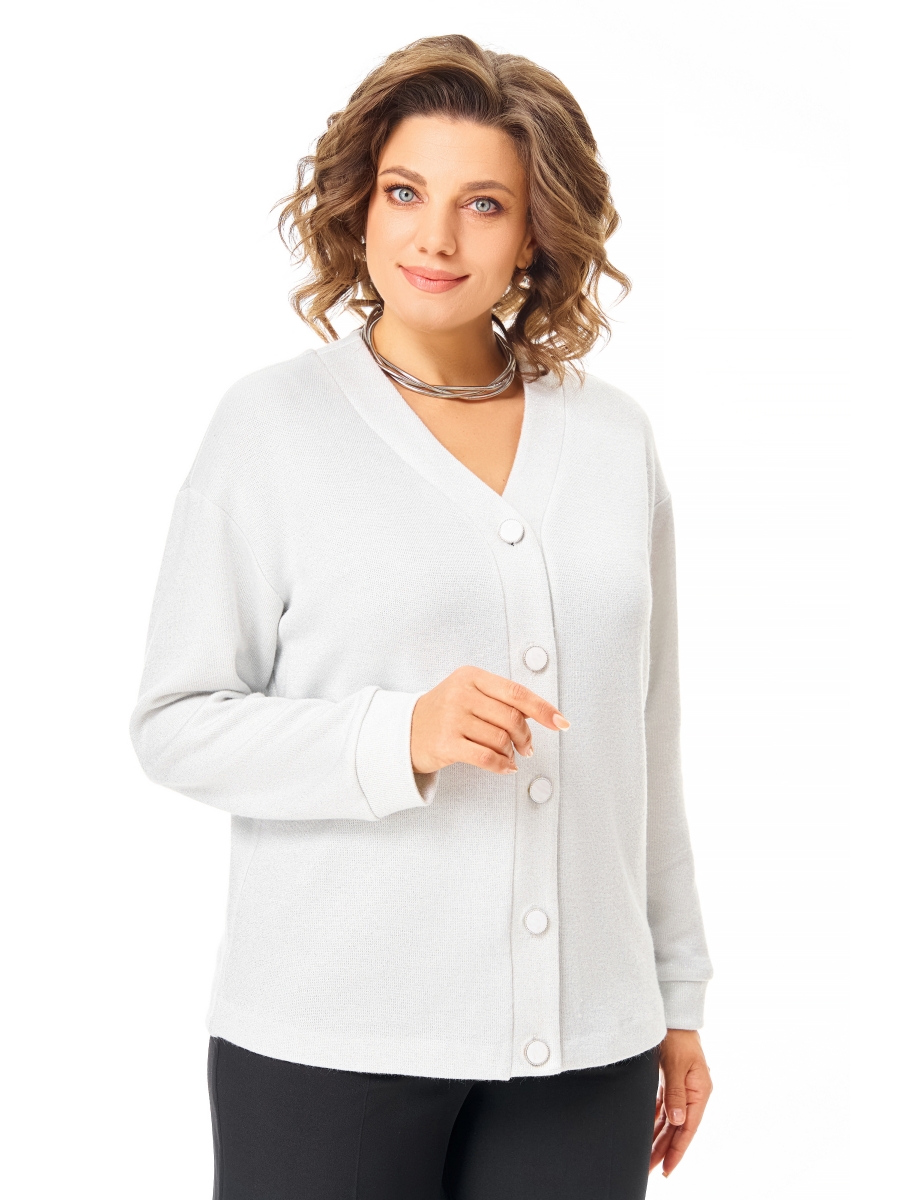 Оформить заказ →Кардиган из мягкого вискозного трикотажного полотна с серебристой люрексовой нитью, прямого силуэта со спущенной линией плеча и центральной застёжкой на петли и декоративные пуговицы. Горловина и борта обработаны фигурной планкой из основной ткани. Вырез горловины V-образной формы, рукав длинный, по низу с манжетой из основной ткани.