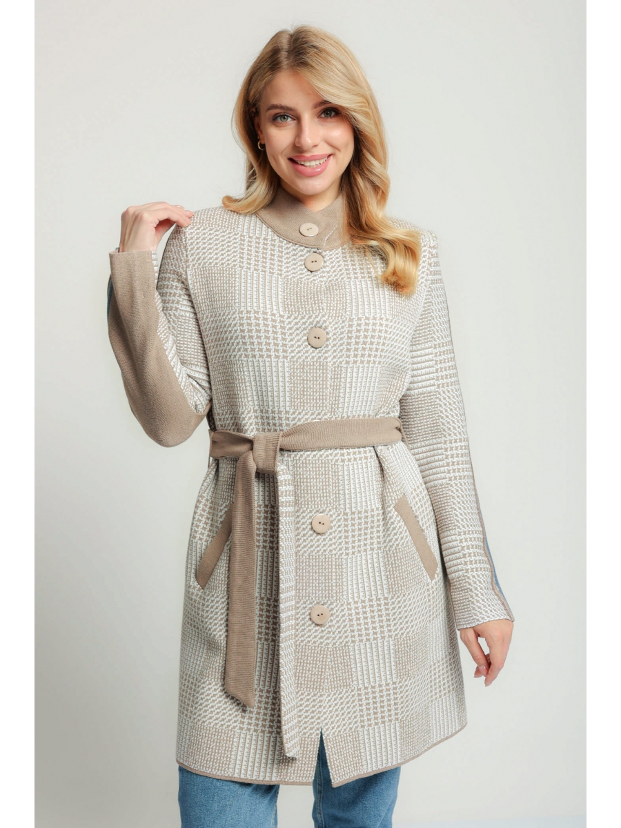 Женский трикотажный кардиган прямого силуэта с поясом. Рукава втачные длинные, воротник-стойка. Застежка на пуговицы. Два прорезных кармана с листочкой. Кардиган выполнен жаккардовым переплетением, образующим клетку. Однотонная спинка.Отделка декоративной бейкой.