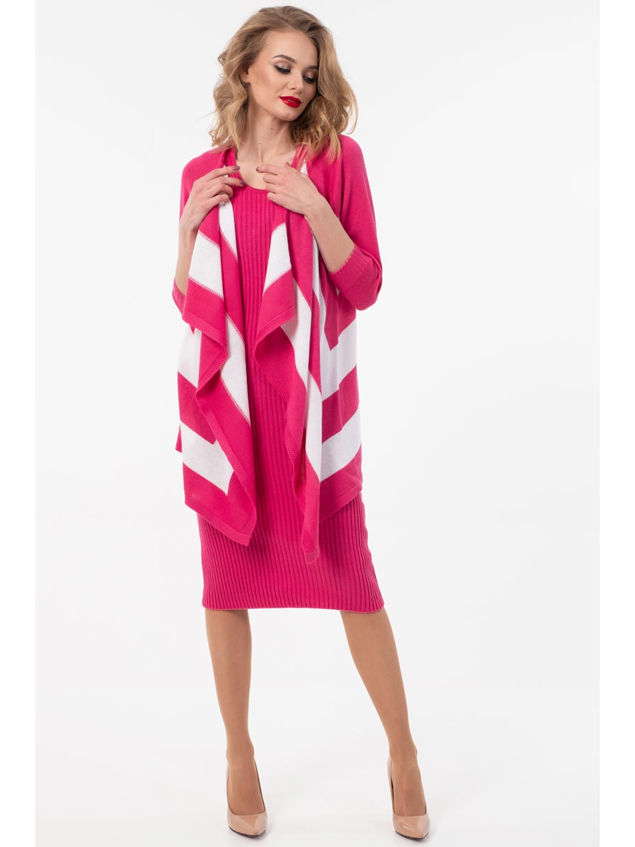 Яркий кардиган полуприлегающего силуэта розово-белого цвета. Кардиган выполнен в технике «ручного вязания» из хлопковых нитей. Изделие со спущенной проймой и втачными рукавами. Аксессуары в комплект не входят.
