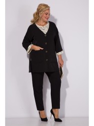 Кардиган с V-образным вырезом горловины, с центральной бортовой застёжкой на пуговицы. Рукав на спущенном плече, длиной 4/4-ти с манжетами из отделочной ткани. По полочке расположены накладные карманы. По бокам предусмотрены разрезы для свободы движения. Изюминкой данной модели служит оригинальная спинка с подрезом и декоративным элементом в виде цепи.