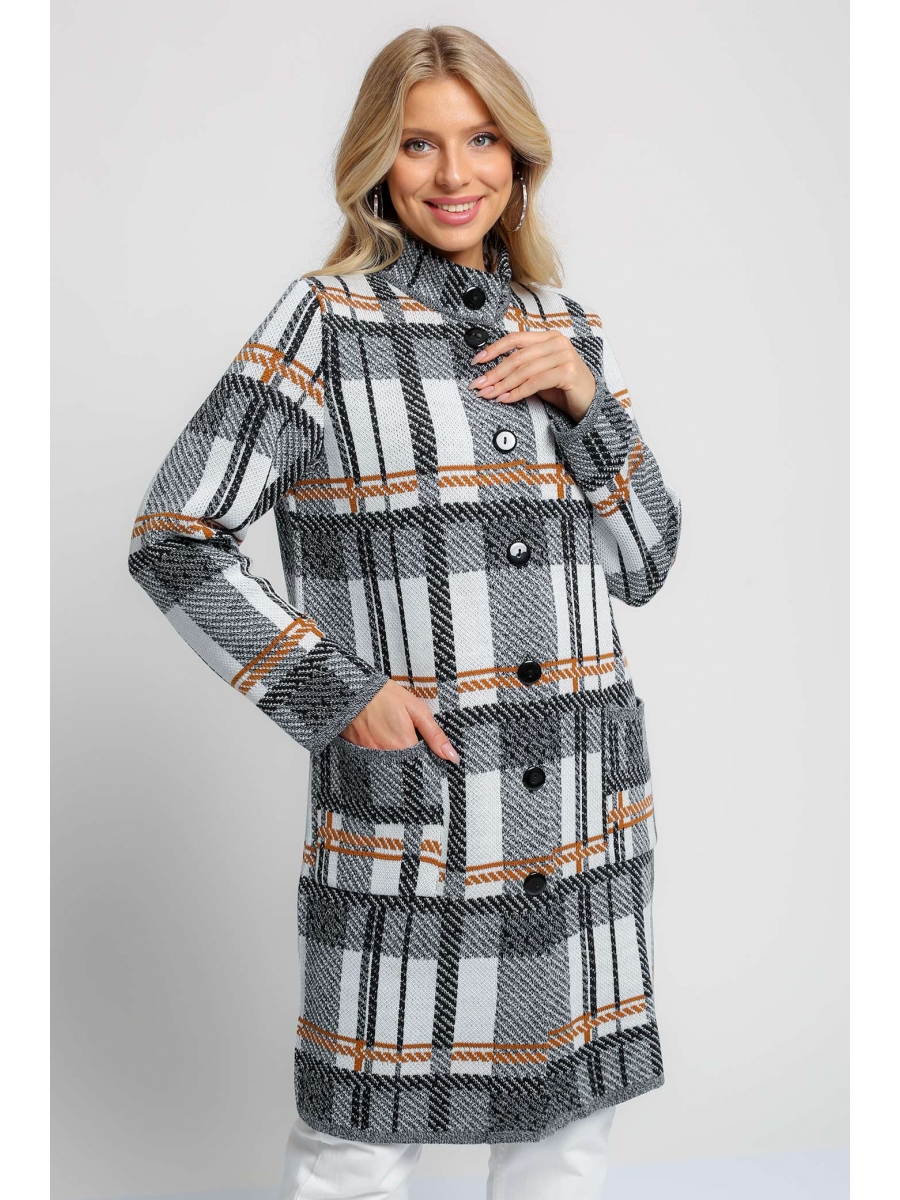 Женский эффектный вязанный кардиган прямого силуэта. Воротник-стойка. Застегивается на пуговицы Рукава втачные длинные. Два накладных кармана. Кардиган выполнен жаккардовым переплетением образующим геометрический рисунок "клетка". Он согреет вас в прохладный день и подарит ощущение невероятного комфорта.